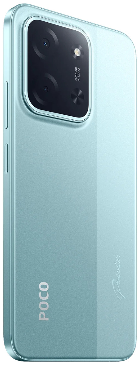POCO C85 сразу обращает на себя внимание крупным 6.9-дюймовым экраном, заключённым в тонкий корпус толщиной всего 7.99 мм. Смартфон весит 205 г и удобно ложится в руку, несмотря на габариты. Задняя крышка выполнена из пластика со стеклянными элементами, а изящные переливы подчёркивают современный стиль устройства.